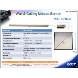 Acer M90-W01MG je nástěnné promítací plátno velikosti 90". Jedná se o plátno roletového typu, které se stahuje manuálním způsobem. Rozměry plochyčiní 1960 x 1100 mm při tloušťce 0,38 mm s poměrem stran 16:9.