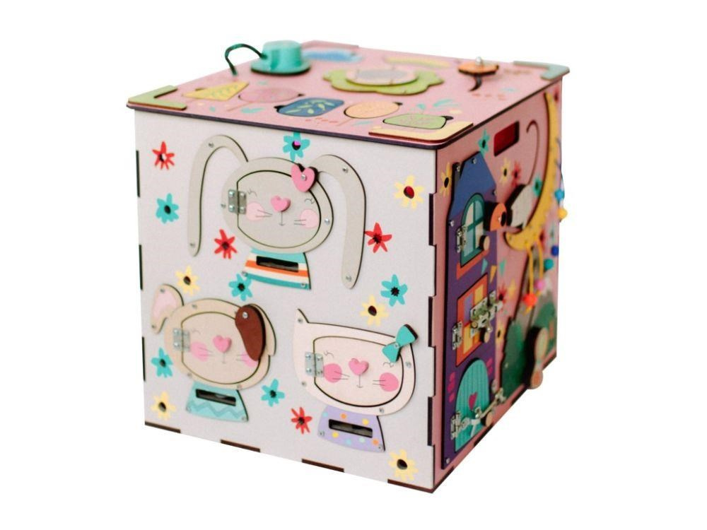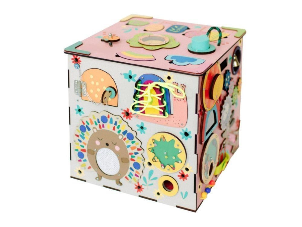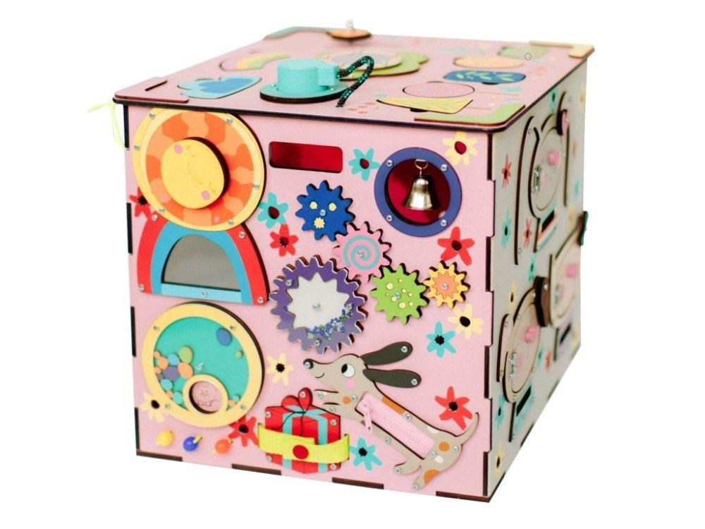 Activity board kostka s LED osvětlením XXL je originální montessori hračkou, která děti zabaví, zdokonalí jejich schopnosti a naučí je novým dovednostem. Každá strana růžového activity boardu je originální a nabízí nespočet možností ke hře, zkoumání a poznávání. Nechybí ozubená kola a kolečka, různé způsoby zapínání, tkanička, různé způsoby zavírání, korálky, bludiště, vkládací puzzle, různá překvapení i sluníčkový vypínač, který activity board kostku rozzáří..