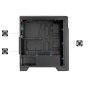 Počítačová skříň se skleněným bočním krytem a RGB ventilátory.