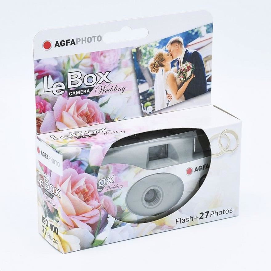 AfgaPhoto LeBox Wedding Flash je snadno použitelný jednorázový fotoaparát, který je dodáván s barevným filmem pro 27 snímků. Fotoaparát má vlastní grafický design, který je speciálně přizpůsoben pro svatby. Také disponuje vestavěným bleskem, který lze zapnout a vypnout malým přepínačem na přední straně fotoaparátu. Díky citlivosti filmu ISO 400 je fotoaparát vhodný pro pořizování fotografií v interiéru i exteriéru. Barevný film vám umožní pořídit 27 fotografií a musí být vyvolán standardním barevným chemickým procesem C-41. Pro vyvolání můžete využít téměř každou fotolaboratoř..