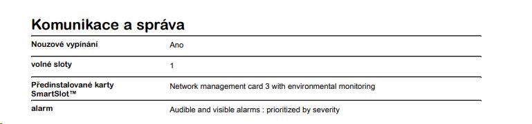 | Dodávka obsahuje | CD se softwarem, Disk CD s dokumentací, Instalační příručka, Záruční karta EPO Terminal block, Teplotní čidlo, Kabel USB, Kabel RJ45-DB9, Kabel Console-DB9, 2ks kabel 2m C19-C20, Odnimatelná podpora, Rack mont úchyty |