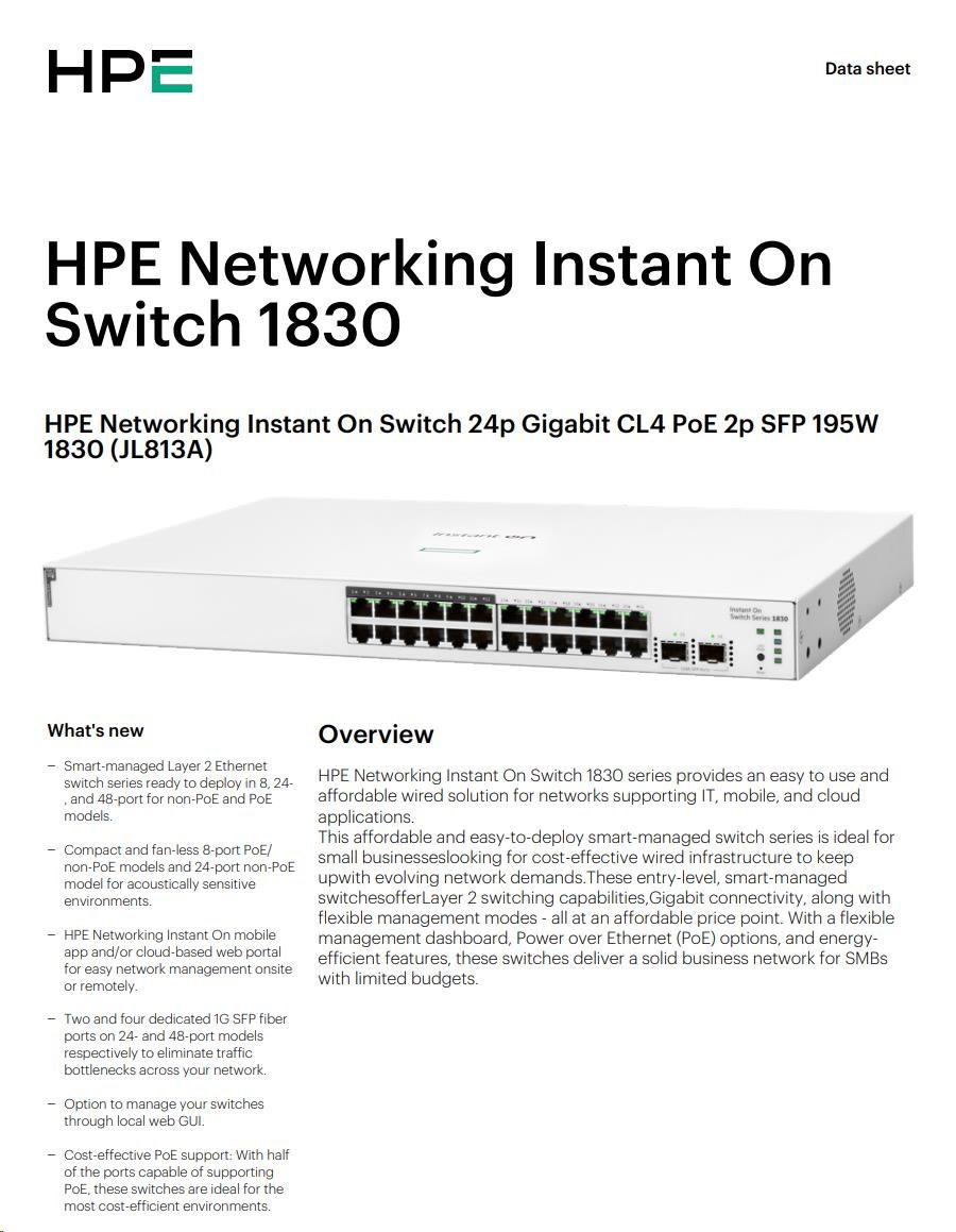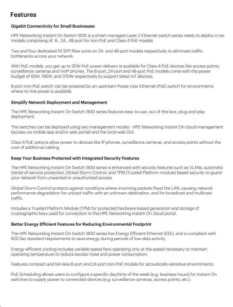 | Aruba Instant On 1830 8G Switch (JL810A) | Aruba Instant On 1830 8G 4p Class4 PoE 65W Switch (JL811A) | Aruba Instant On 1830 24G 2SFP Switch (JL812A) | Aruba Instant On 1830 24G 12p Class4 PoE 2SFP 195W Switch (JL813A) | Aruba Instant On 1830 48G 4SFP Switch (JL814A) | Aruba Instant On 1830 48G 24p Class4 PoE 4SFP 370W Switch (JL815A) | ||||
