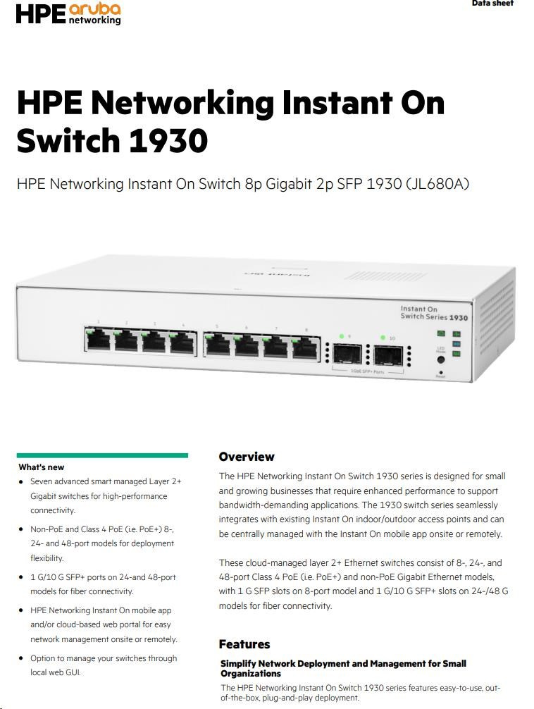 Řada přepínačů Aruba Instant On 1930 se vyznačuje snadným používáním a nasazením typu "plug-and-play" po vybalení z krabice.Řadu přepínačů Aruba Instant On 1930 lze nasadit pomocí dvou způsobů. Režimů správy - Instant On cloud-management (přístup přes síť). Druhou variantou je využití mobilní aplikace a/nebo webového portálu a místního webového grafického rozhraní.Řada přepínačů Aruba Instant On 1930 se vyznačuje snadným používáním a nasazením typu "plug-and-play" po vybalení z krabice.Řadu přepínačů Aruba Instant On 1930 lze nasadit pomocí dvou způsobů. Režimů správy - Instant On cloud-management (přístup přes síť). Druhou variantou je využití mobilní aplikace a/nebo webového portálu a místního webového grafického rozhraní.
