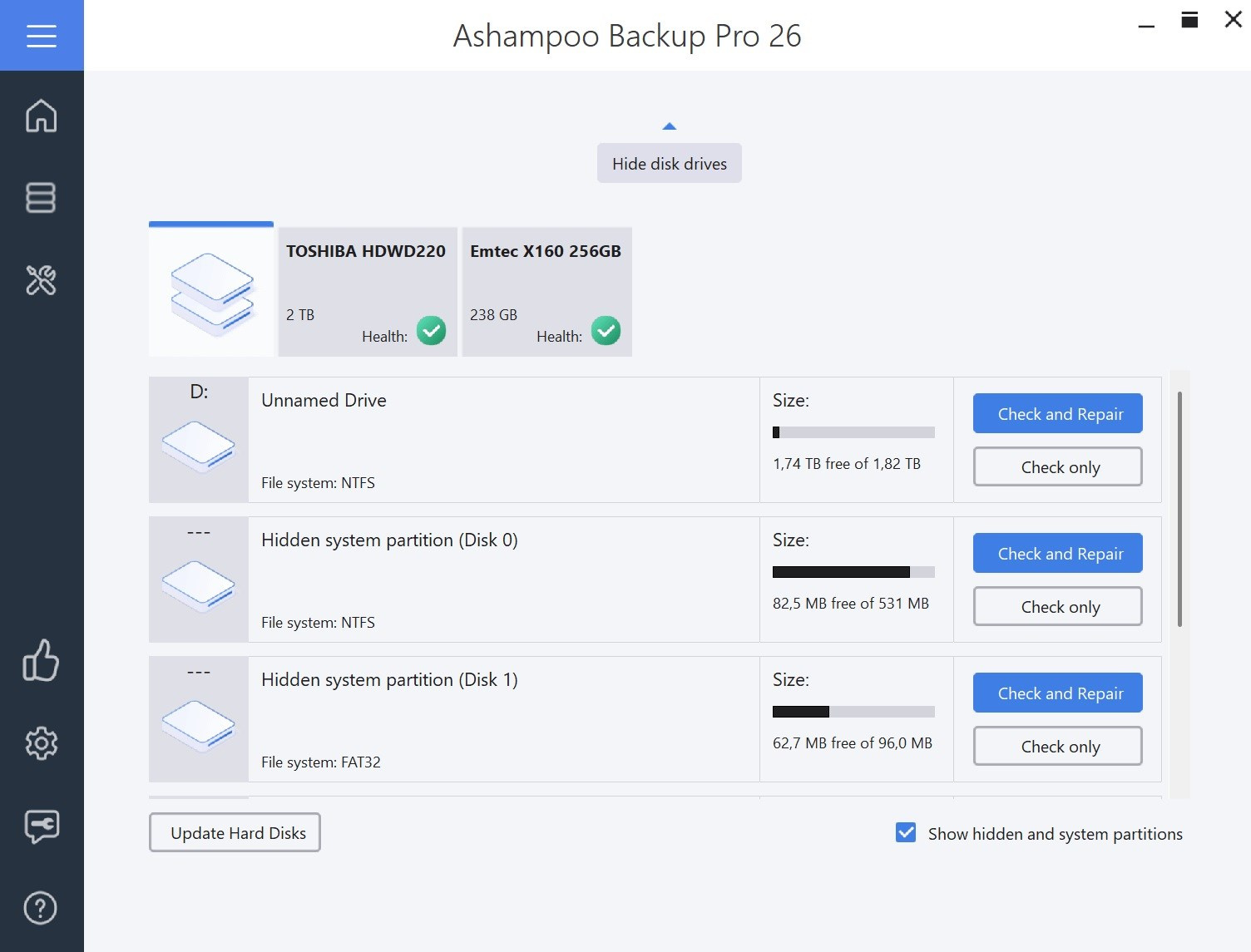 Záloha je tak bezpečná, jak bezpečný je pevný disk, na kterém je uložena! Proto Ashampoo® Backup Pro během zálohování sleduje parametry SMART vašeho pevného disku, aby odhalil budoucí problémy dříve, než nastanou! Díky tomu máte čas reagovat a zabránit ztrátě dat. Program je také vybaven dodatečnou kontrolou disku/oddílu, která analyzuje a opravuje jednotlivé sektory. Ať už se jedná o interní nebo externí disk, Ashampoo® Backup Pro se o vaše pevné disky postará mimořádně dobře!