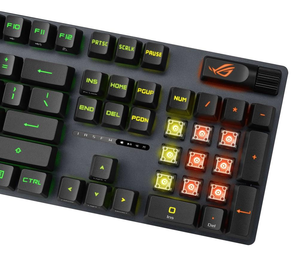 - PBT / ABS klávesy s UV vrstvou: Odolné klávesy ROG PBT doubleshot nebo klávesy ABS s UV vrstvou nabízejí prvotřídní pocit a odolnost proti lesku