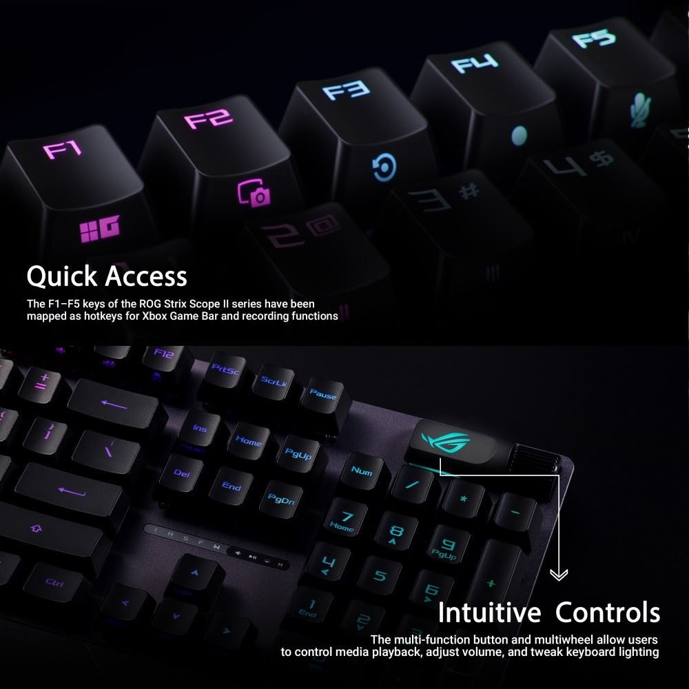 Herní klávesnice ROG Strix Scope II s předem namazanými mechanickými spínači ROG NX Red, pěnou tlumící zvuk, dvojitými krytkami kláves PBT nebo ABS s UV povlakem, klávesovými zkratkami pro streamování, multifunkčními ovládacími prvky, třemi úhly sklonu a opěrkou zápěstí