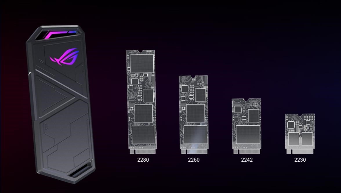 ROG Strix Arion Lite, externí box pro M.2 NVMe SSD úložiště – USB 3.2 Gen 2 Type-C (10 Gb/s), kabel USB-C do USB-C, instalace bez použití šroubováku, obsahuje tepelné podložky, vhodný pro PCIe 2280/2260/2242/2230 M key/B+M Key