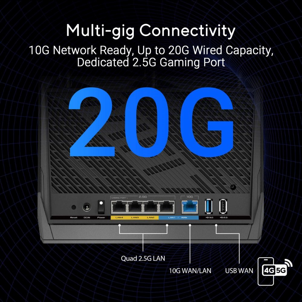 RT-BE86U se může pochlubit dvoupásmovou technologií WiFi 7, která dosahuje bleskové rychlosti až 6800 Mb/s a zajišťuje bezproblémové streamování, hraní her a provádění datově náročných úloh. Ať už sledujete své oblíbené pořady, nebo spolupracujete na virtuální schůzce, tento router vám to umožní.