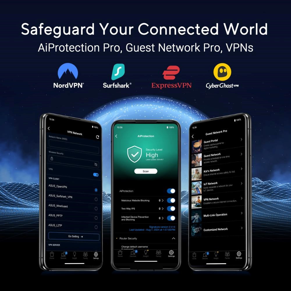 | Zabezpečení | AiProtection VPN WPA3 Personal, WPA2 Personal, WPA Personal, WPA Enterprise, WPA2 Enterprise, WPA3 Enterprise, Open System & OWE WPS Let's Encrypt DNS-over-TLS SSH Bezpečnostní skenování Firewall - Maximální filtr klíčových slov brány firewall : 64 - Maximální filtr síťových služeb brány firewall : 32 - Maximální filtr URL brány firewall : 64 |