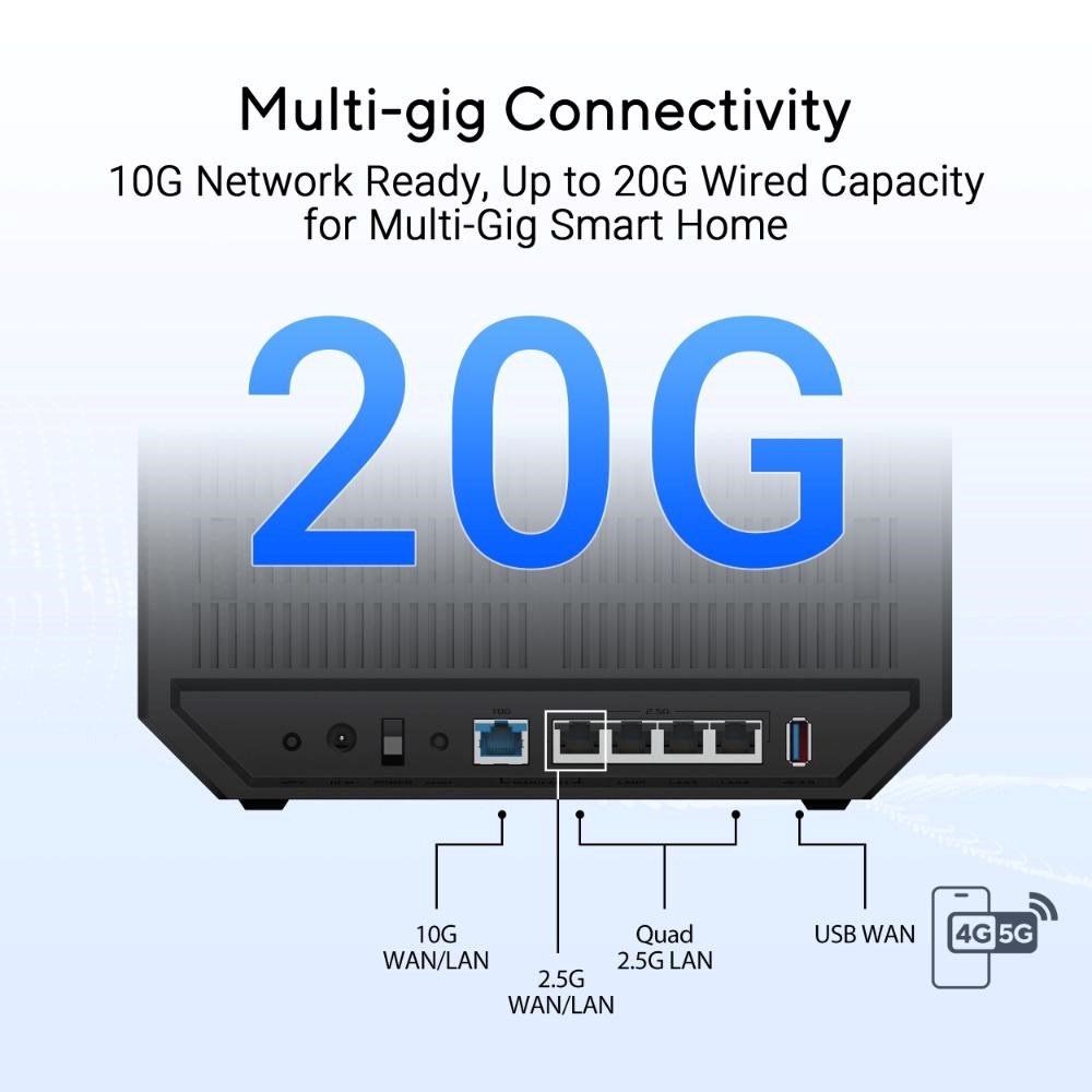 Vylepšete svou chytrou domácnost díky bleskurychlému třípásmovému WiFi 7 s rychlostí až 9700 Mb/s, zvýšenému dosahu díky technologii ASUS RF a technologii Smart AiMesh s umělou inteligencí a až 20G kabelové kapacitě. ASUS uvolňuje vynikající 6GHz WiFi a budoucí 10G sítě. Díky nové sadě ASUS Network Security a pokročilým funkcím, jako je například IoT Network, zabezpečuje vaši síť end-to-end, 24 hodin denně, 7 dní v týdnu.