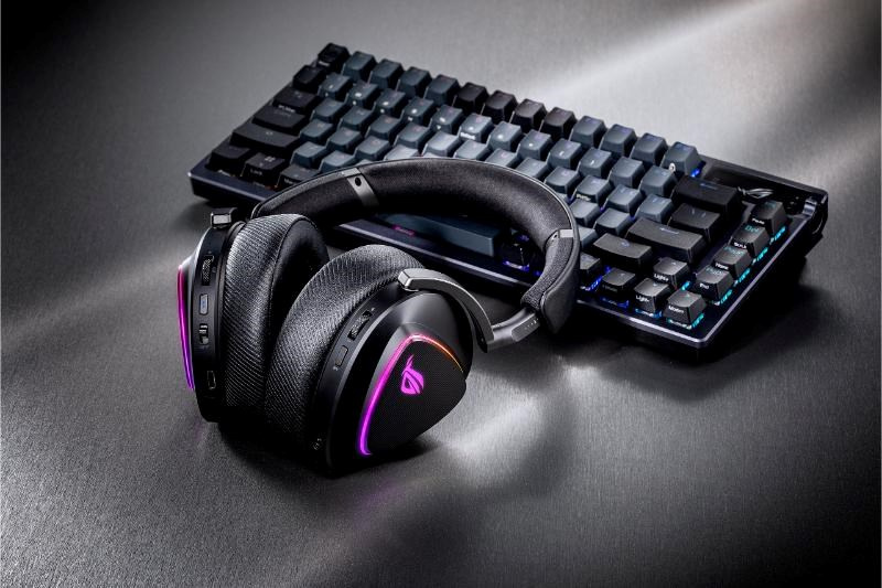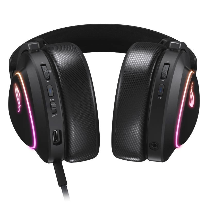 Bezdrátová herní náhlavní souprava ve třech režimech s ROG SpeedNova, 50mm drivery s titanovou membránou a vytříbeným zvukem, 10mm super širokopásmový mikrofon, DualFlow Audio, výdrž baterie až 110 hodin, lehký design 318 g, plus RGB osvětlení ASUS Aura Sync