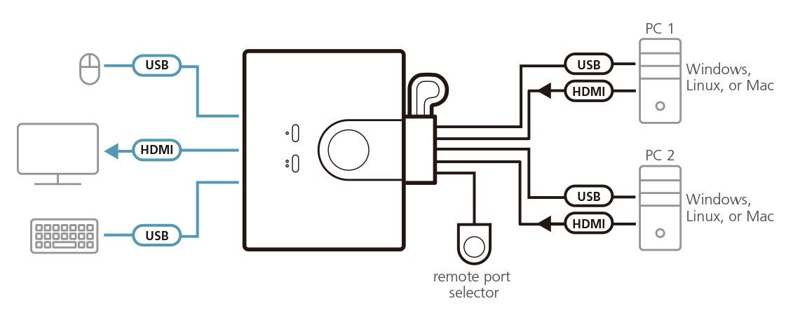 CS22HF ATEN 2-port HDMI KVM USB mini, integrované kabely, tlačítko pro přepínání CS22HF 2-Port USB FHD HDMI kabel KVM Switch je řídící jednotka, která umožňuje přístup ke dvěma počítačům z jedné USB a HDMI konzole a zároveň nabízí kvalitu videa až 1920 x 1080 @ 60 Hz / 1920 x 1200 @ 60 Hz. S CS22HF můžete rychle a bez námahy přepínat mezi dvěma USB HDMI počítači pomocí tlačítka na dálkovém voliči portů. CS22HF podporuje multiplatformní operace, které vám umožňují přepínat mezi dvěma různými počítači s operačním systémem. Kompaktní design napájený ze sběrnice navíc umožňuje efektivní a organizovanou instalaci a poskytuje ideální řešení šetřící místo, aby byl váš stůl dobře uspořádaný. Tento přepínač plug and play je ideální pro lidi, kteří potřebují rychlé ovládání pro multitasking mezi dvěma počítači na ploše v jakémkoli prostředí. Funkce - Jedna KVM konzole ovládá dva počítače s rozhraním USB a HDMI - Vynikající kvalita videa – až 1920 x 1080 při 60 Hz / 1920 x 1200 při 60 Hz - Výběr počítače pomocí Remote Port Selector - Kompatibilní s HDMI; Vyhovuje HDCP 1.4 - Multiplatformní podpora – Windows, Mac a Linux - Porty USB konzoly lze použít pro sdílení periferií USB - Podporuje USB hot-plugging - Napájený ze sběrnice USB.