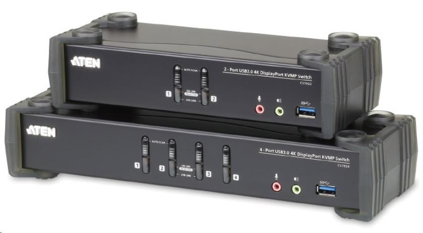 Aten CS1924 4-port 4K DisplayPort KVMP 3.0 přepínač umožní jednomu uživateli sdílet čtyři připojené počítače za pomocí jedné klávesnice, myši a monitoru.