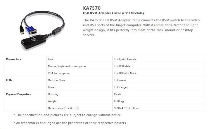 | Konektory | USB samec typ A 1x VGA samec 1x 1x RJ-45 pro připojení do KVM |