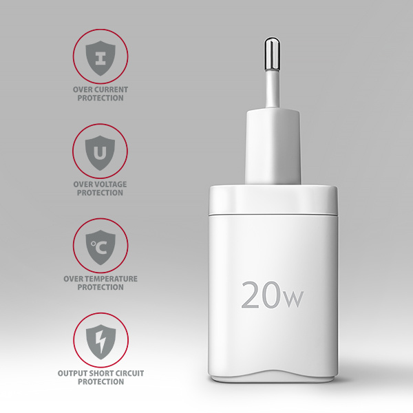 Pokročilý systém ochran na výstupu nabíjecího adaptéru chrání nabíjené zařízení před poškozením. Funkce nabíječky také zajistí rozpoznání nabíjeného zařízení a zvolení optimální rychlosti a průběhu nabíjení.