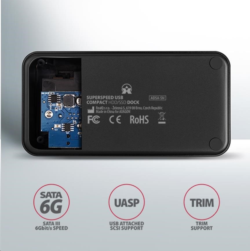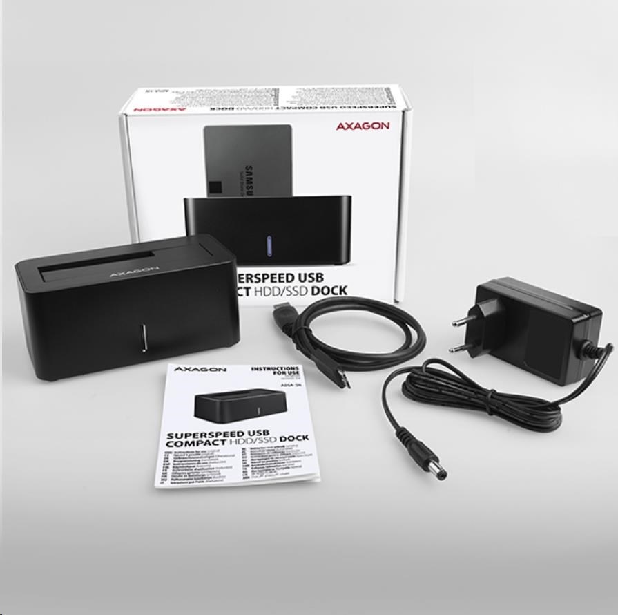 SuperSpeed USB dokovací stanice AXAGON ADSA-SN COMPACT HDD/SSD DOCK připojí k počítači snadno a rychle libovolný SATA disk.
