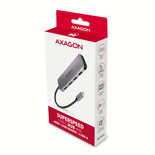 AXAGON HMC-HCR3A, USB 3.2 Gen 1 hub, porty 3x USB-A, HDMI 4k/30Hz, SD/microSD, kabel USB-C 20cm