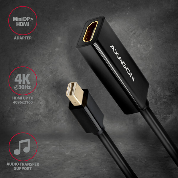 Mini DisplayPort -> HDMI aktivní adaptér AXAGON RVDM-HI14N pro připojení HDMI monitoru/TV/projektoru k počítači s výstupem Mini DisplayPort.
