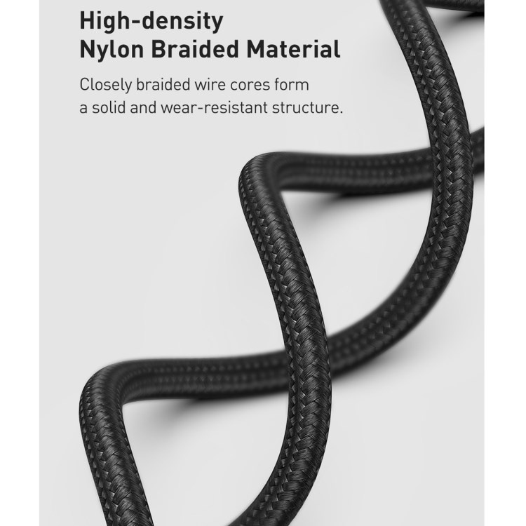 Kabel je vyroben z nylonového opletení odolného proti prasklinám a deformacím a zesílené spoje a hliníkové zátky zabraňují prasklinám a jinému poškození.