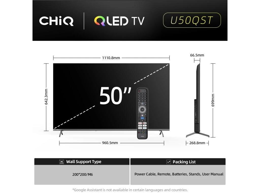 CHiQ 50“ U50QST, ultratenká metalická bezrámečková QLED Smart Google TV 5.0 s několika herními funkcemi, HDR10, HLG, obrazovkou s Ultra HD s rozlišením 3840 x 2160 pixelů, prostorovým zvukem Dolby Audio a dbx-tv.