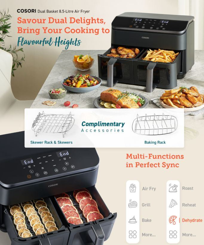 Pokud hledáte způsob, jak připravovat různá jídla současně, aniž byste museli používat více zařízení nebo dělat kompromisy v chuti, pak je pro vás horkovzdušná fritéza Cosori Dual Basket tou správnou volbou. Má dva nezávislé koše, které umožňují připravit dva různé pokrmy najednou, s různým nastavením teploty a času. Cosori Dual Basket využívá technologii 360 ThermoIQ™, která zajišťuje, že vaše jídla budou rovnoměrně uvařená, šťavnatá uvnitř a křupavá zvenčí s použitím malého množství anebo vôbec žádného oleje. Horkovzdušná fritéza Cosori Dual Basket se velmi snadno ovládá a využívá dotykový ovládací panel s intuitivním rozhraním. Díky průhledným okénkům z kvalitního borosilikátového skla na přední stěně fritovacích košů a vestavěnému světlu můžete sledovat své jídlo během přípravy, aniž byste museli fritézu otevírat.