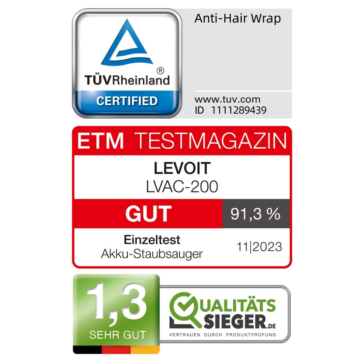 V nezávislém testu německého ETM Testmagazin dosáhl Levoit LVAC-200 vysokého hodnocení a známky GUT. V testu byla například naměřena ještě nižší hlučnost, než udává výrobce a to 73 dB v ECO režimu a 75 dB v Turbo režimu.