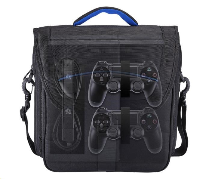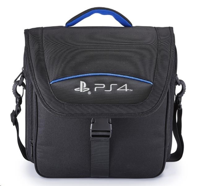 V této cestovní brašně bude vaše oblíbená herní konzole PlayStation 4 v bezpečí, ať už vás cesta zavede kamkoliv. Zatímco pro vlastní konzoli je vyhrazeno místo ve velké hlavní přihrádce uzavíratelné na zip, v sousední menší přihrádce – rovněž uzavíratelné na zip a opatřené gumovými řemínky – snadno upevníte až dva ovladače. Síťovaná kapsa v této přihrádce poté pojme jak kameru, tak i nezbytné kabely. V klopě překlenující obě přihrádky a uzavíratelné na přezku se navíc nachází další kapsa na zip, v níž se najde dostatek místa pro různé drobné příslušenství. Díky plastovým výstupkům na spodní stranědna si brašna udržuje potřebnou stabilitu a vy se tak nemusíte obávat toho, že by se i s konzolí převrátila na bok. Brašnu vyvedenou v černé barvě lze pohodlně přenášet nejenom v ruce, ale s pomocí nastavitelného popruhu i přes rameno.