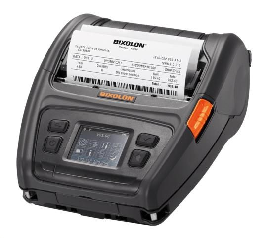 label printer, mobile printer, direct thermal, resolution: 8 dots/mm (203 dpi), media width (max.): 112 mm, print width (max.): 104 mm, roll diameter (max.): 66mm, speed (max.): 127 mm/s, USB-C, RS232, Bluetooth (iOS), LCD Display, Black Mark Sensor, Gap Sensor, emulation: ZPLII, BXL/POS, SLCS, CPCL, RAM: 128 MB, Flash: 256 MB, incl.: power supply unit, power cable, belt strap, battery, 6800 mAh.