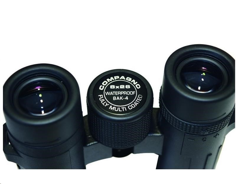 Dalekohled kompaktní COMPAGNO 10x26, zvětšení 10x, přední čočka 26mm, zorné pole 98m, ostré od 4m, optický výstup 2,6mm, vzdálenost středu očí 56-74mm s odstupem 14,1mm, světelnost 6,8, stmívání 16,1, rozměry 117x115x40 mm, hmotnost 325g, černý. Dalekohledy kompaktní DCF se střechovými hranoly BaK4 - ROOF (DACH). Modelová řada s moderním designem, malými rozměry, nízkou hmotností a vysokou optickou kvalitou pro kontrastní pohled i při zhoršených světelných podmínkách. Výkonný a odolný dalekohled s Fully Multicoated úpravou, hranoly z BaK4 skla, voděodolný do 0,5m/15min s ochranou proti zamlžení plněním Dusíkem, vhodné i pro sledování s brýlemi, nastavení +/-4 dioptrie, výsuvné krytky okuláru, stativový závit, pogumováné tělo z ABS. Včetně textilního pouzdra, popruhu a čistícího hadříku. Malý ale maximálně výkonný dalekohled do kapsy pro turistiku..