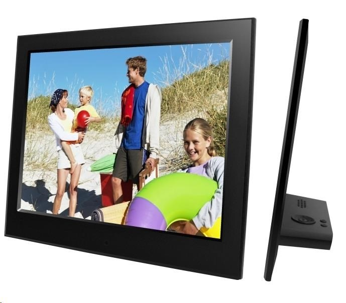 Digitální fotorámeček s úhlopříčkou 8", ultratenký 6,5 mm s opěrkou, vysoké rozlišení 1280x800px, 16:10, Motion Senzor pohybu, prohlížení obrázků ve formátu JPEG, poslech hudby MP3/WMA a přehrávání videa Full HD MPEG1/2/4, multislot SD/MS a USB2 flash max 32GB, Audio out, Auto Start/ON/OFF, funkce: SlideShow (prezentace), náhledy, zoom a otáčení obrázků, budík, hodiny, kalendář. Rozměr: 220x176x23 mm, hmotnost 440 g. Součástí dodávky síťový zdroj AC/DC 5V/1,5A, dálkové ovládání.