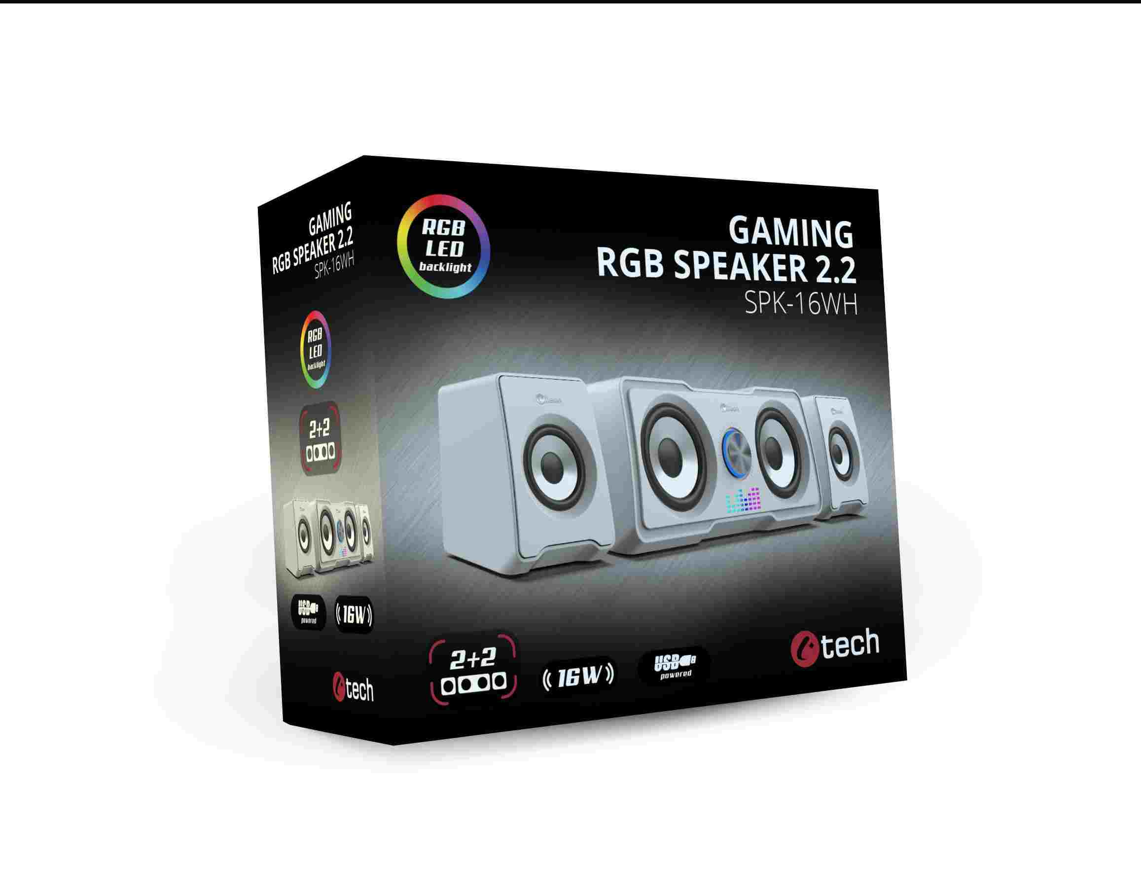 Kompaktní PC reproduktory C-tech SPK-16WH 2.2 vám zprostředkují kvalitní zvuk s výkonem 16W a frekvenčním rozsahem 150-20kHz. Díky unikátní kombinaci měničů 2+2 je reprodukovaný zvuk bohatší a více dynamický, takže si jej využijete nejen při poslechu oblíbených skladem, ale i při hraní her. O jedinečnou atmosféru při poslechu hudby se postará automatické RGB podsvícení. K ovládání hlasitosti poslouží regulátor nacházející se na jednom z reproduktorů. Tento regulátor slouží k zapnutí a vypnutí zařízení. Připojení soustavy k zařízením zajistí kabel s 3,5mm jackem, napájení zase USB kabel.