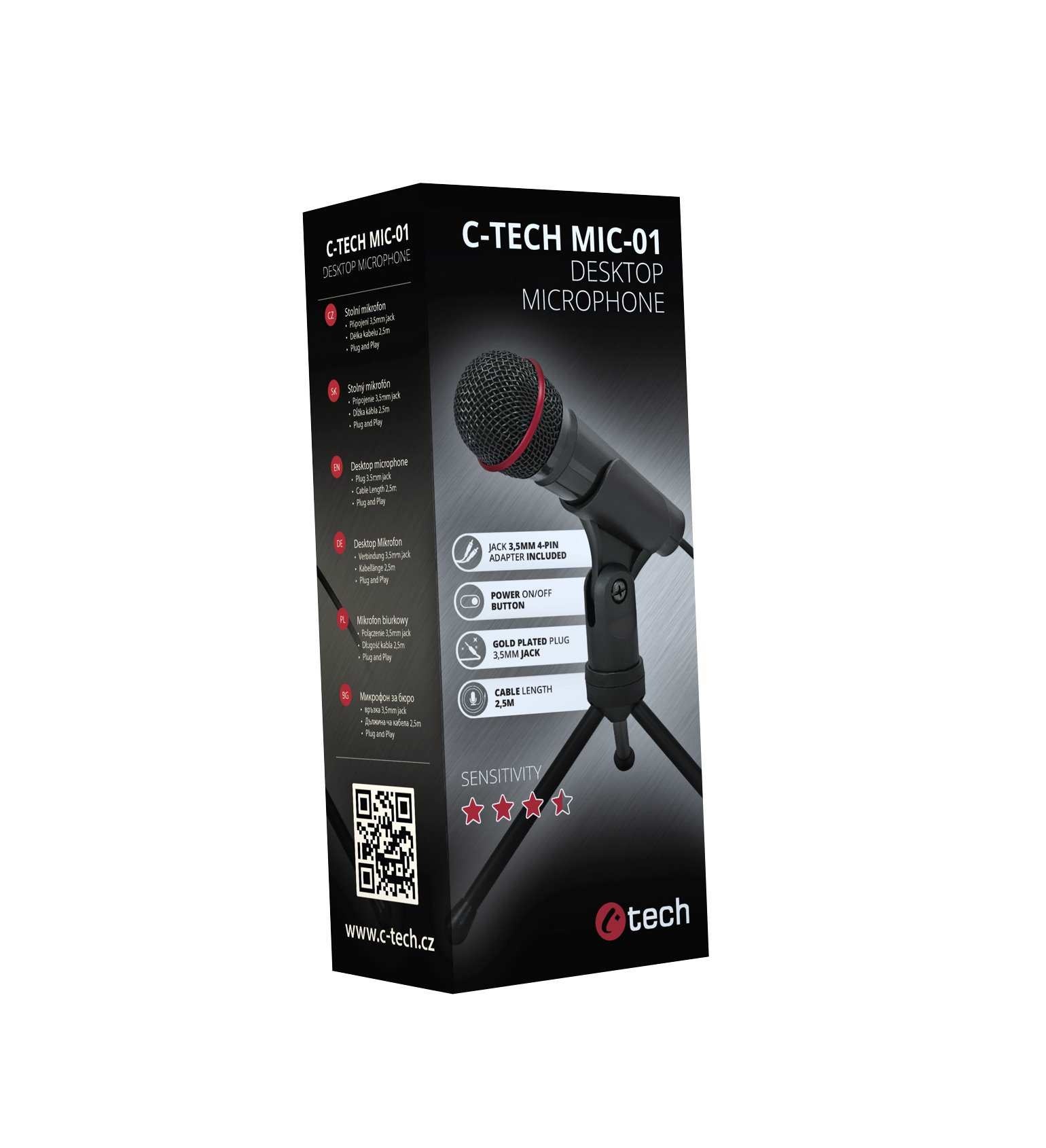 C-TECH MIC-01 je kvalitní mikrofon s přirozenou kvalitou reprodukce hlasu pro každodenní použití. Své uplatnění najde jak při použití s komunikačními programy, tak i při vytváření youtube videí nebo live přenosů. Mikrofon se připojuje pomocí 2,5m kabelu s pozlaceným stereo konektorem jack 3,5mm, v balení však naleznete i redukci jack stereo 3-pin/4-pin pro připojení mikrofonu k zařízení, které je vybaveno sloučeným audio konektorem pro mikrofon a sluchátka. Mikrofon je vybaven zapínacím tlačítkem ON/OFF. V balení naleznete praktický podstavec (tripod), díky kterému lze umístit mikrofon do různých poloh.