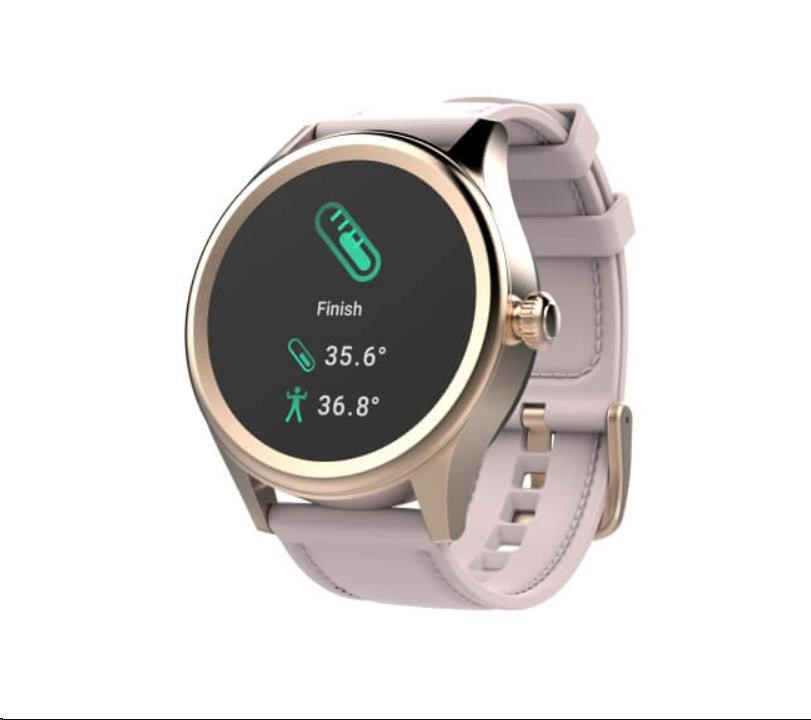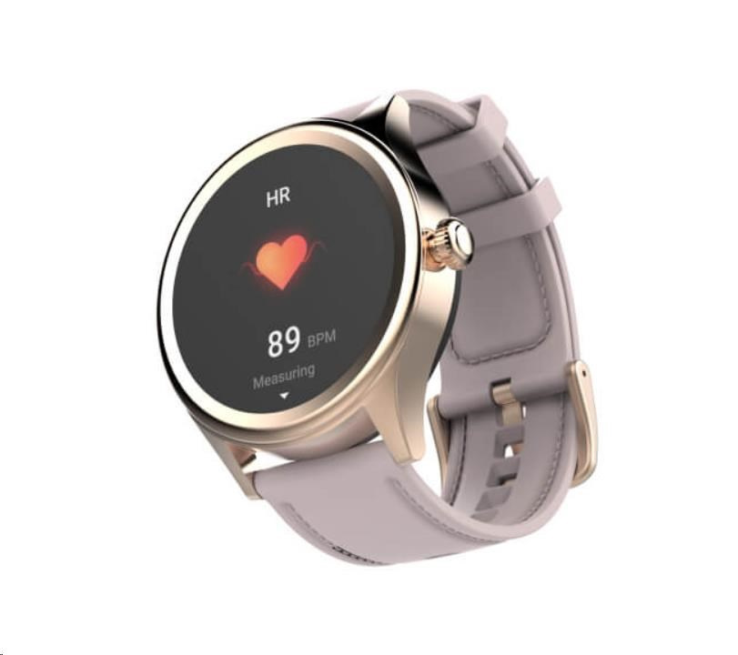 Smart hodinky Carneo Prime GTR v elegantním zlatém provedení, barevným dotykovým displejem lze aktivovat jednoduchým otočením ruky. Kromě běžných "smart" funkcí disponují i fitness sportovními funkcemi a to vše v elegantním business look provedení. Rosegold silikonový řemínek v designu koženého pásku s prošíváním umocňuje jejich eleganci.