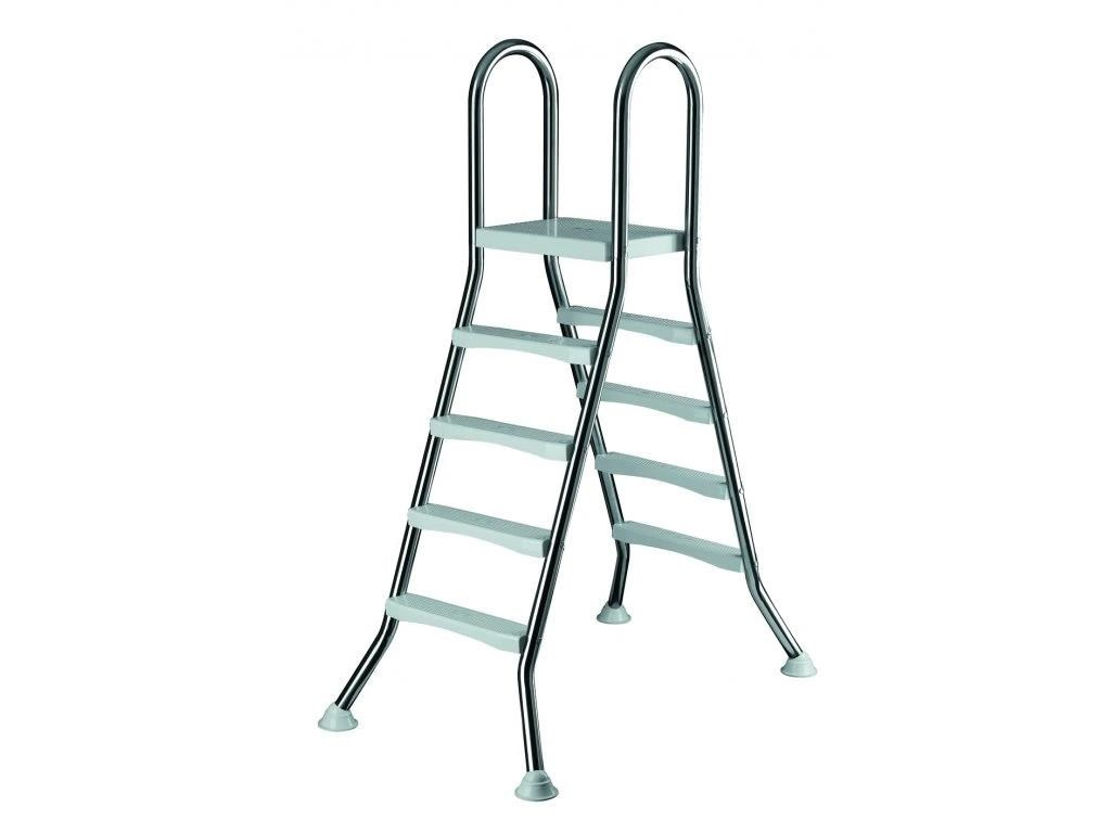 Bazénový žebřík pro bazény se stěnou až 122 cm, vyrobený z kvalitní nerezové oceli, která zajistí jeho dlouhou životnost. Žebřík má silné stabilní plastové schodnice a plošinu s protiskluzovou úpravou, udrží hmotnost až 150 kg. Žebřík má 4 stupně na vnitřní a vnější straně. Nohy žebříku jsou zakončeny koncovkami z protiskluzové gumy se stabilní podložkou, které zabraňují nechtěnému pohybu žebříku a zvyšují tak bezpečnost. Zároveň zabraňují poškození vašeho bazénu.