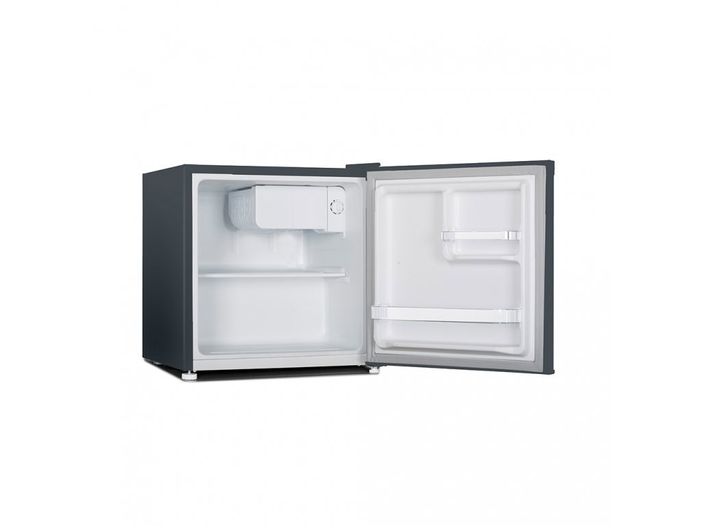 Minibar, objem 46l, 2 přihrádky + skleněná polička + 2 poličky ve dveřích, tmavě šedá metalická barva, manuální regulace teploty od 0 °C do 10 °C, 35 dB, zapuštěná madla, oboustranné panty dveří, LowFrost minimalizující námrazu, klimatická třída ST,N, eko chladivo R600a, energetická třída F..