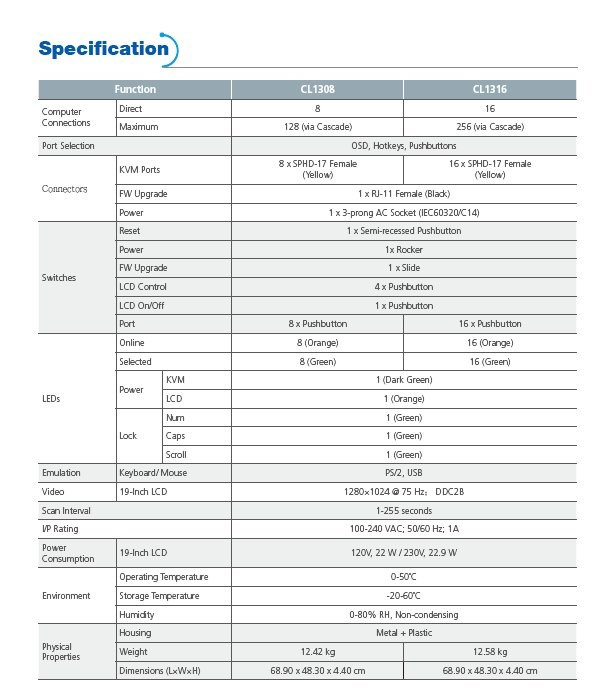 CL1316 ATEN 16-port KVM PS/2+USB, OSD, rack, 19" LCD, touchpad, klávesnice KVM přepínač s integrovanou klávesnicí, touchpadem a LCD 19" ve skladném vysouvacím šuplíku. Vhodný do serverové místnosti, kde Vám ušetří místo. Ke KVM přepínači je možno připojit až 16 PC s rozhraním USB nebo PS/2, je montovatelný do racku. Možnost přepínač ovládat tlačítek, klávesovou zkratkou nebo přes vestavěné OSD menu. - vestavěný 16 port KVM přepínač - vestavěný LCD 19" - kompletní klávesnice, touchpad - rozlišení LCD až 1280x1024@75 DDC2B - možnost připojit/odpojit PC bez restartu přepínače - není třeba software - přepínání pomocí hot key, tlačítka, OSD menu - auto scan mod pro zjištění připojených PC - kaskádovatelný - signalizace stavu pomocí několika LED diod - možnost připojit počítače po USB i PS/2 (řeší se kabely) - Broadcast mod - operace se realizuje na všech připojených PC najednou - včetně úchytů do racku 19" - dvou úrovňová ochrana heslem - podpora systémů Windows/Mac/Linux/Sun - černá barva Specifikace: konektory pro vstup sdružený 15p Canon třířadý Female (je třeba použít sdružený kabel!) Vhodné kabely: USB 2L-5202U 2L-5203U 2L-5206U PS/2 2L-5202P 2L-5203P 2L-5206P V balení: 1ks CL1316 KVM přepínač s držákem do racku 1ks napájecí kabel 2ks sady kabelů KVM pro připojení počítače 1ks Firmware Upgrade kabel 1ks Rychlý návod