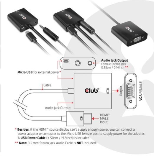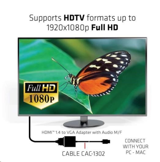 The Club 3D CAC-1302 is an active HDMI™ 1.4 to VGA signal converter. It allows you to convert digital HDMI™ signal into analog VGA signal and extracts audio signal from HDMI™ signal through the R/L audio port.