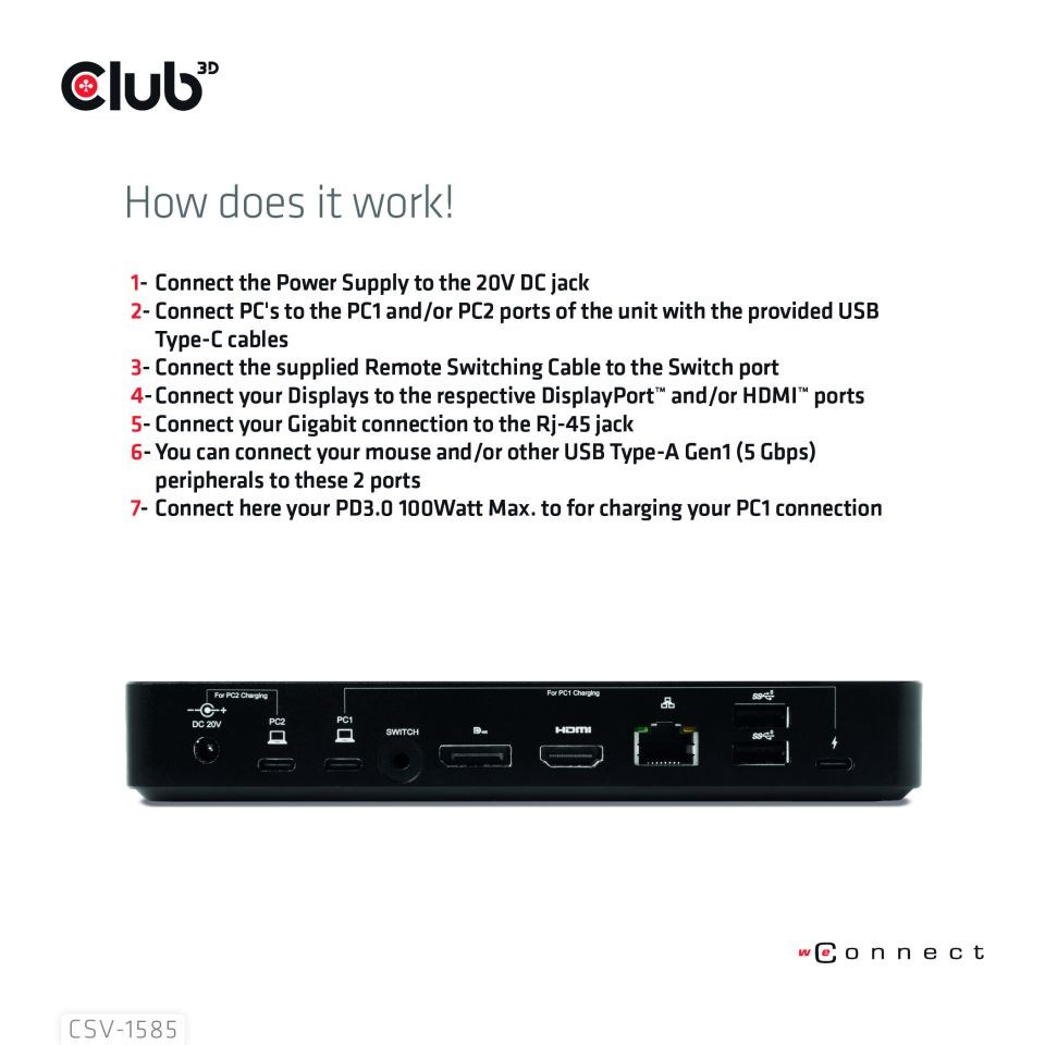 Club 3D CSV-1585 je dokovací stanice MST s duálním (HDMI+DP) displejem s funkcí KVM. Dva USB Type-C vstupy pro připojení dvou různých hostitelů pro rychlé zvýšení produktivity mezi dvěma hostiteli, stačí jedno kliknutí na horní tlačítko nebo kliknutím na tlačítko dálkového ovladače připojeného kabelu. 3xUSB Type-A+3xUSB Type-C poskytují dostatečné připojení pro externí zařízení s přenosem dat až 5Gbps. 120W stejnosměrný zdroj poskytuje 65W napájení (PD) pro nabíjení vašeho notebooku USB Type-C nebo hostitelských zařízení. Kompatibilní s jakýmkoli zařízením podporujícím režim DP Alt Mode s portem USB Type-C, jako je notebook, stolní počítač, tablet, telefon atd. Podporujte nabíjení pomocí portů PC1 a PC2, stisknutím tlačítka POWER SWITCH přepněte vstupní napájení. Použití 20V/6A 120W DC napájecího adaptéru pro napájení dokovací stanice, mezi 65W nabíjením pro hostitele PC2 současně. Externí napájení pro PC1 přes port USB Type-C1, nabíjecí výkon závisí na adaptéru PD. Se zámkem Kensington. Zapoj a hraj.