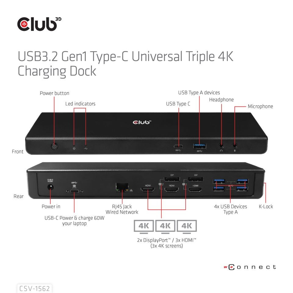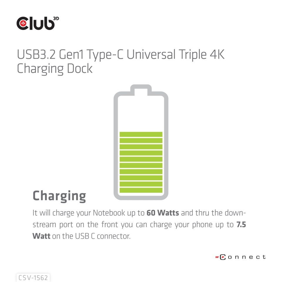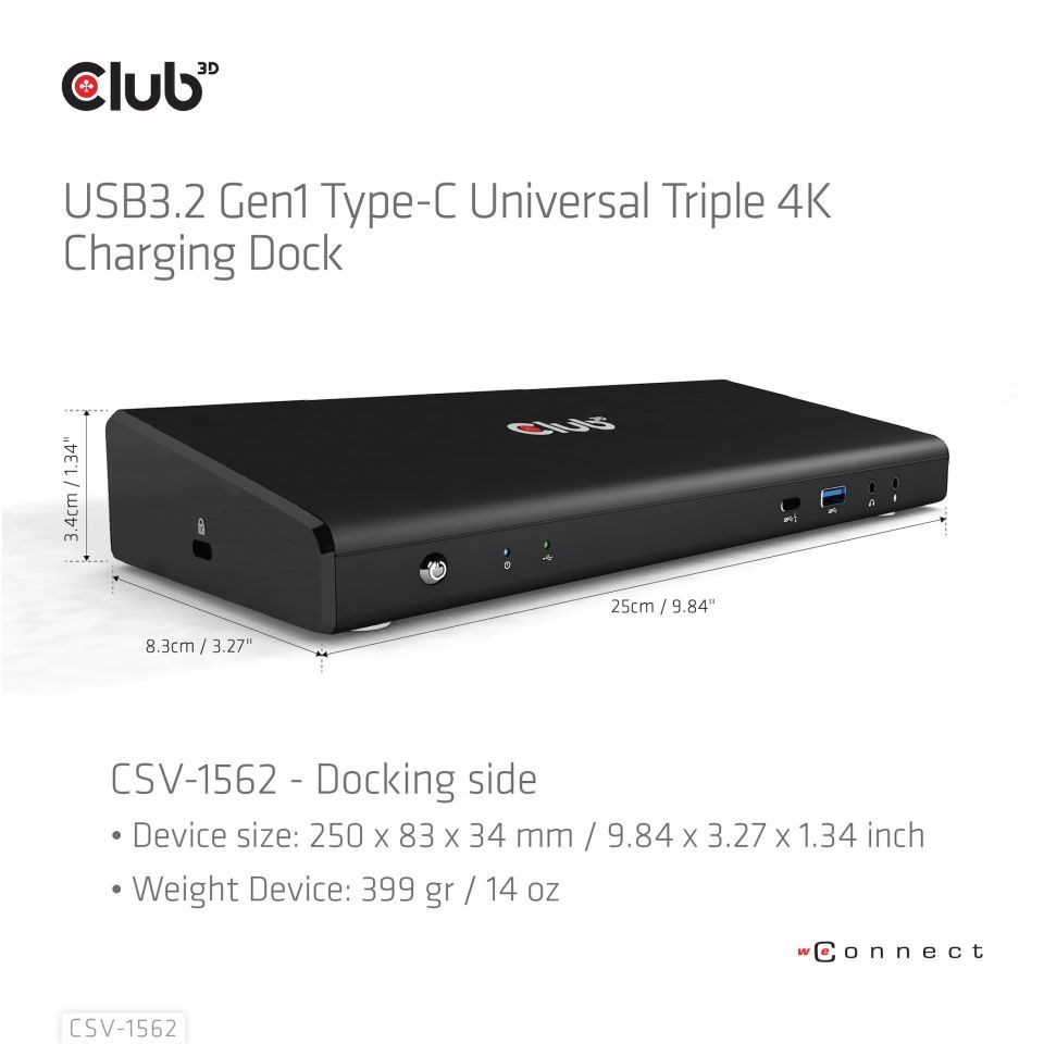 | Package Contents | Club 3D CSV-1562 USB C 3.2 Gen1 Universal Triple 4K Charging Dock External Power Supply 100-240V AC, 135W, Power Cord USB-C cable Installation CD Driver |