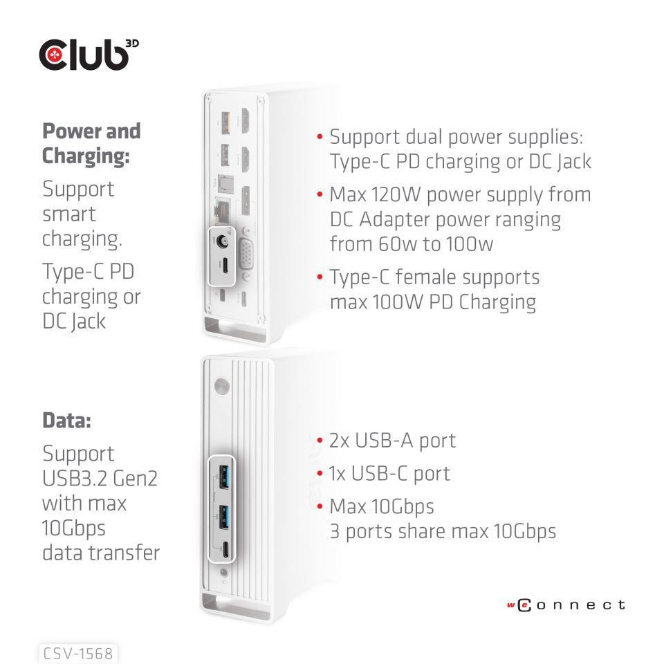 The Club 3D CSV-1568 USB Gen2 Type-C Triple Display DP™ Alt mode + Smart PD Charging Dock with 120 Watt PSU, is an integrated solution combining Video, Data, Power, Ethernet and Audio. It has 4 videos (output 3 videos simultaneously under MST mode) for video transmission, 4 USB data ports (2 USB-A 10G, 1 Type-C 10G, 1 USB-A 5G)for data transmission, 1 USB-A smart charging port for quick charging, 1 Gigabit Ethernet for super fast Ethernet, 2 audio ports (3.5mm audio, Toslink) for enjoying music. Besides, this dock is equipped with dual power jack (Type-C PD Charging or 120W DC power supply).