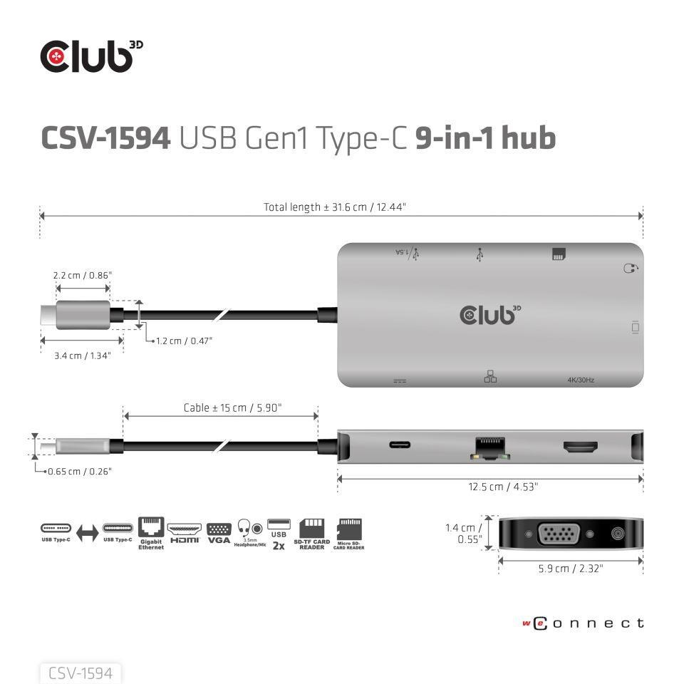 Club3D hub USB-C, 9-in-1 hub s HDMI, VGA, 2x USB Gen1 Type-A, RJ45, 100W PD