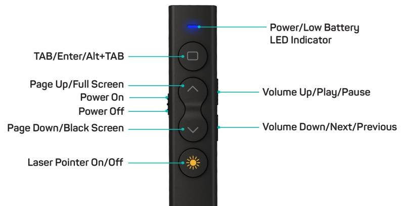 | Funkce prezentéru | - TAB/ENTER/ALT+TAB - PAGE UP/FULL SCREEN - PAGE DOWN/BLACK SCREEN - VOLUME UP/PLAY/PAUSE - VOLUME DOWN/NEXT/PREVIOUS |