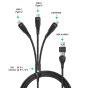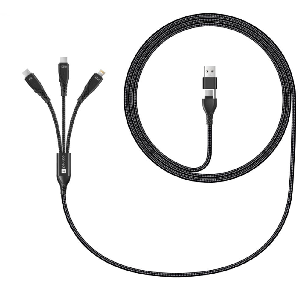 Univerzální nabíjecí kabel 6v1 pro nabíjení zařízení s konektory 2x USB-C,1x Lightning se vstupním konektrom USB-C a redukcí na USB-A. Umožňuje nabíjení až tří zařízení současně s podporou rychlého nabíjení pomocí max. proudového toku 5 A. Speciální manžetová nadstavba konektorů zaručuje lepší přístupnost k nabíjecím zdířkám mobilních telefonů v pouzdrech.