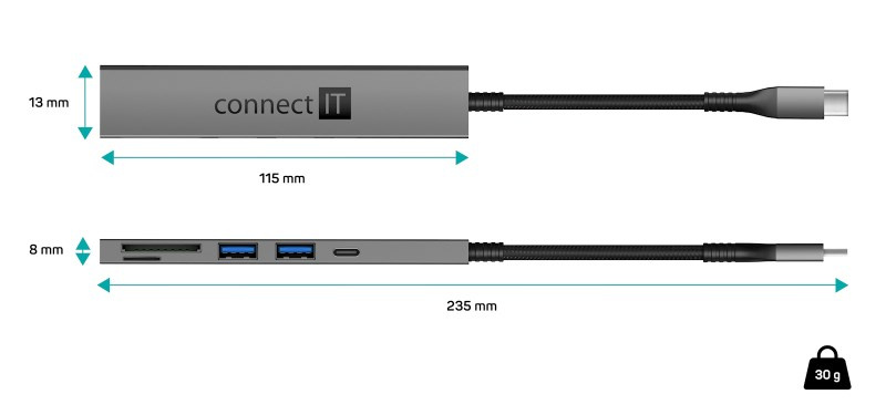 Prakticky tvarovaný USB-C hub pro připojení až 3 USB periferií (1 x USB-C a 2 x USB-A), 1x SD karty a 1x MicroSD karty. Umožní připojení např. myši, klávesnice, MP3 přehrávače, scanneru, tiskárny, digitálního fotoaparátu, externího pevného disku, flashdisku atd.