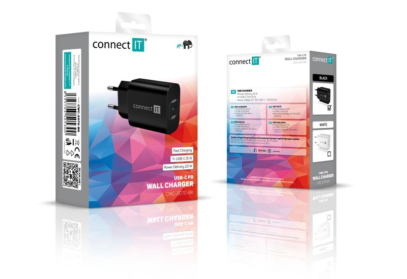 Cestovní USB nabíječka CONNECT IT "Voyager2" určená pro napájení i nabíjení mobilních telefonů, tabletů, power bank, akčních kamer, elektronických čteček knih, MP3 a MP4 přehrávačů, herních konzolí a mnoha dalších přenosných zařízení doma, v kanceláři i na cestách. Technologie Power Delivery (PD) umožňuje rychlonabíjení o výkonu 25 W.