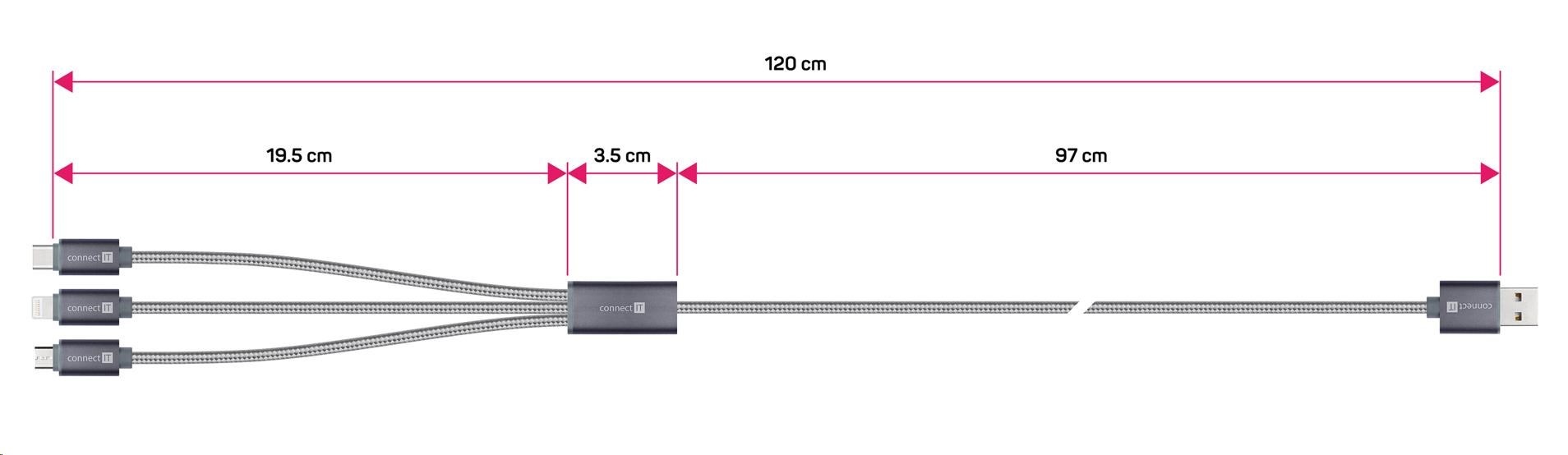 CONNECT IT Wirez 3in1 USB-C & Micro USB & Lightning, silver gray, 1,2 m