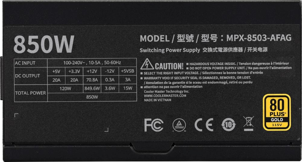Cooler Master zdroj 850W MWE Gold 3, 120mm, 80+ Gold, Plně modulární, ATX 3.1