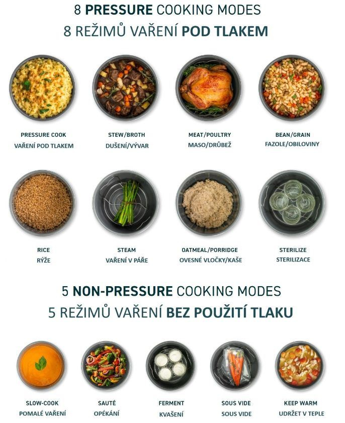 - Tlakové vaření, rýže, pára, ovesné vločky/kaše, dušené maso/vývar, fazole/zrno, maso/drůbež, jogurt, koláč, pomalé vaření, soté, Sous Vide, udržování teploty
