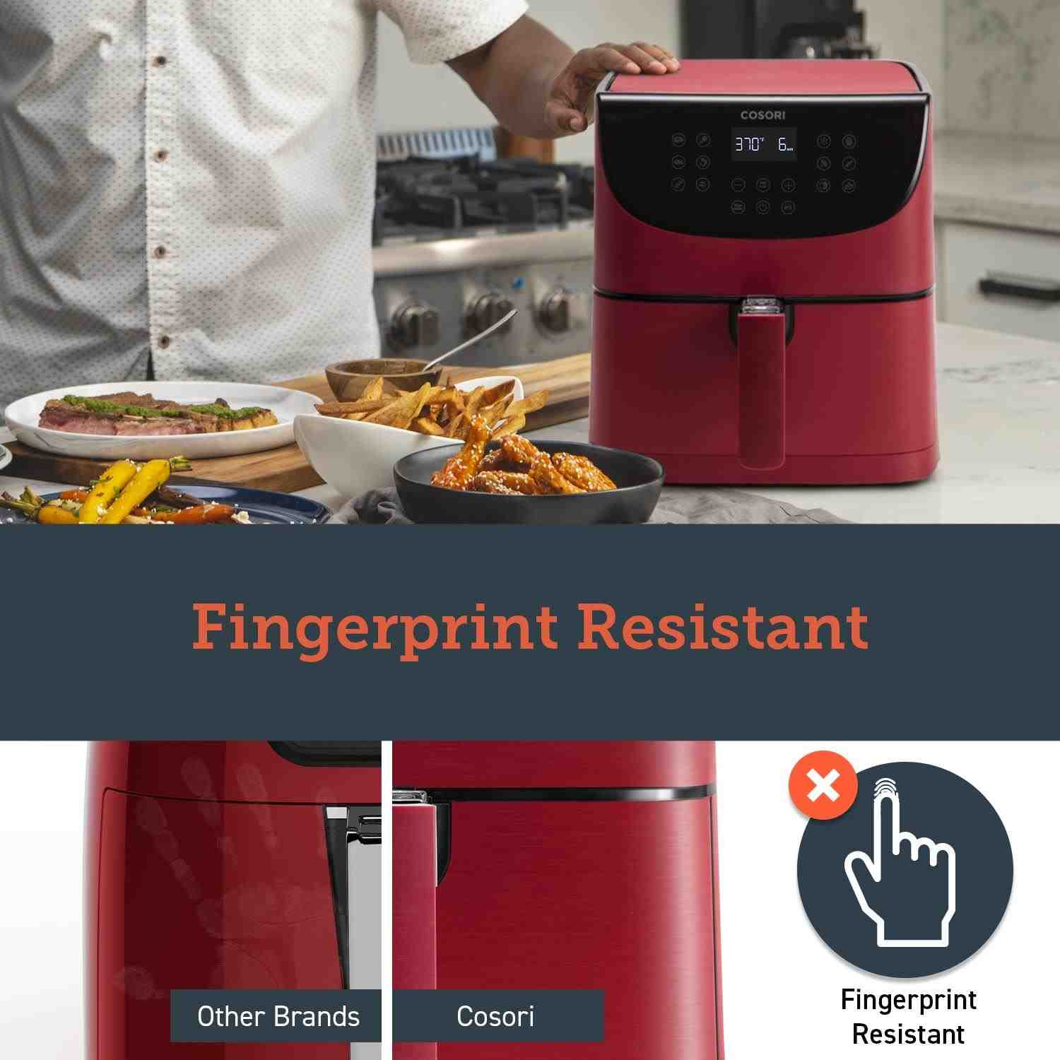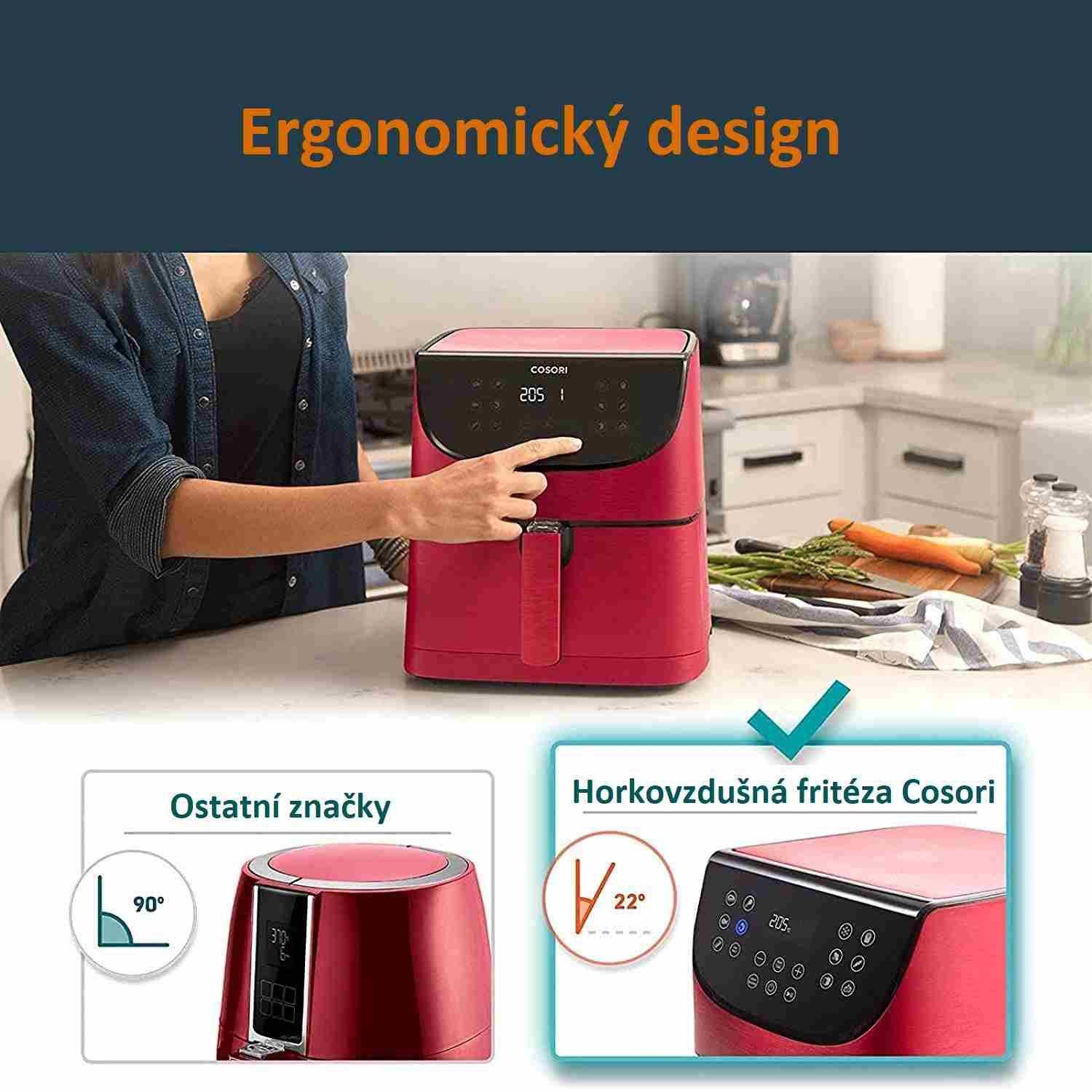 Design horkovzdušné fritézy COSORI CP158-AF byl navržen v Kalifornii. Díky své praktičnosti, funkcím, ovládání i přehlednému dotykovému nakloněnému LED displeji se snadno přístupnými tlačítky získal také prestižní ocenění Red Dot Award a Design Award za nejlepší design. Povrchová úprava je navíc odolná vůči otiskům prstů, takže fritéza bude ve vaší kuchyni vypadat pořád skvěle. Podle prodejních statistik je značka COSORI také nejprodávanější značkou horkovzdušných fritéz v USA.