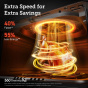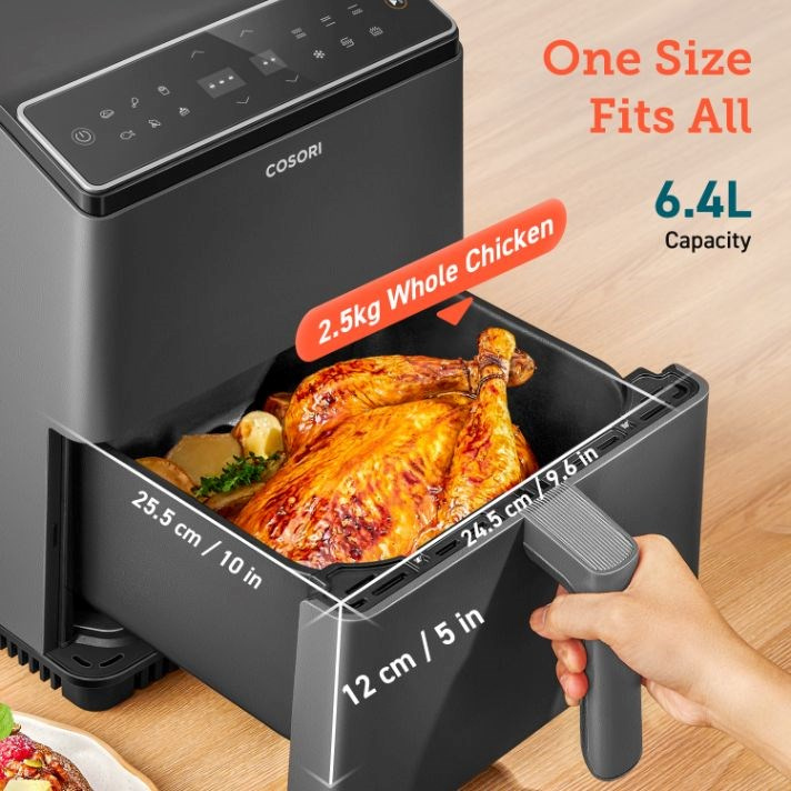 Horkovzdušná fritéza COSORI CAF-P583S se chlubí obrovským objemem koše 6.4 litru s praktickým čtvercovým tvarem, díky čemuž uspokojí i početnější domácnosti. S výkonem 1700 W je fritéza extrémně výkonná, což zkracuje dobu vaření a šetří tak elektrickou energii. Díky velikosti varného prostoru fritézy je možné připravit třeba i celé 3,5 kg kuře v kuse nebo 17 kuřecích křidýlek, která by se do fritézy s kruhovým košem nebo objemem 3-4l vešla jen velice těžko.